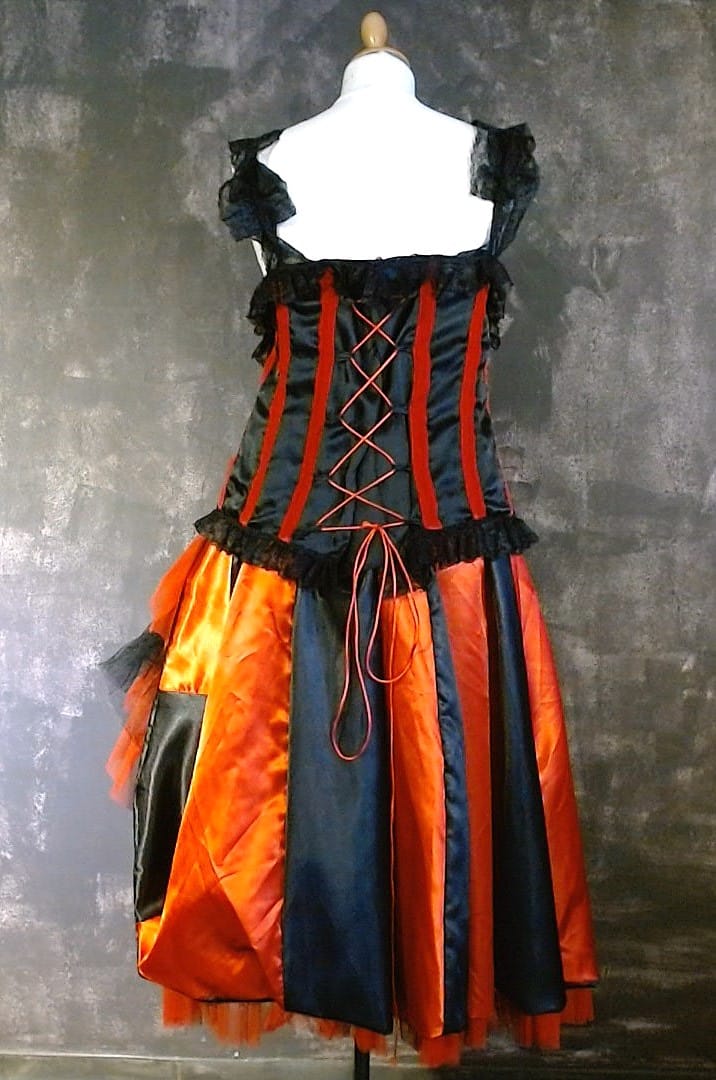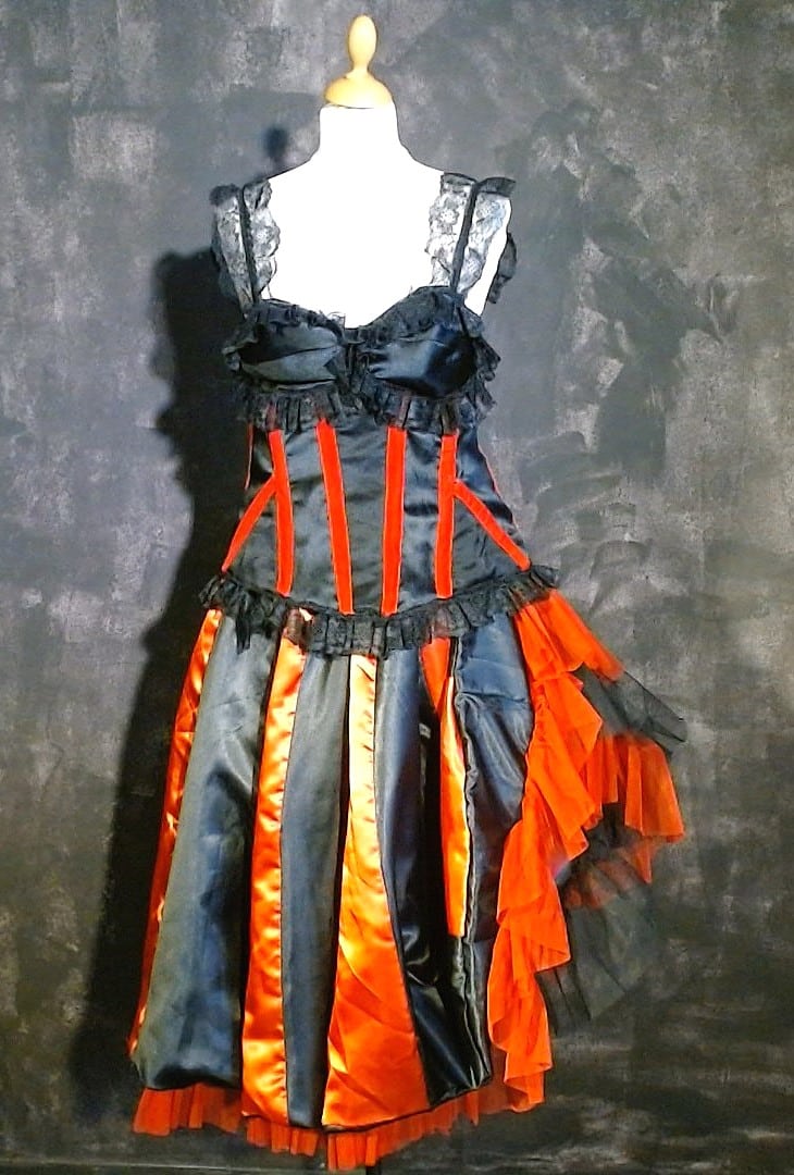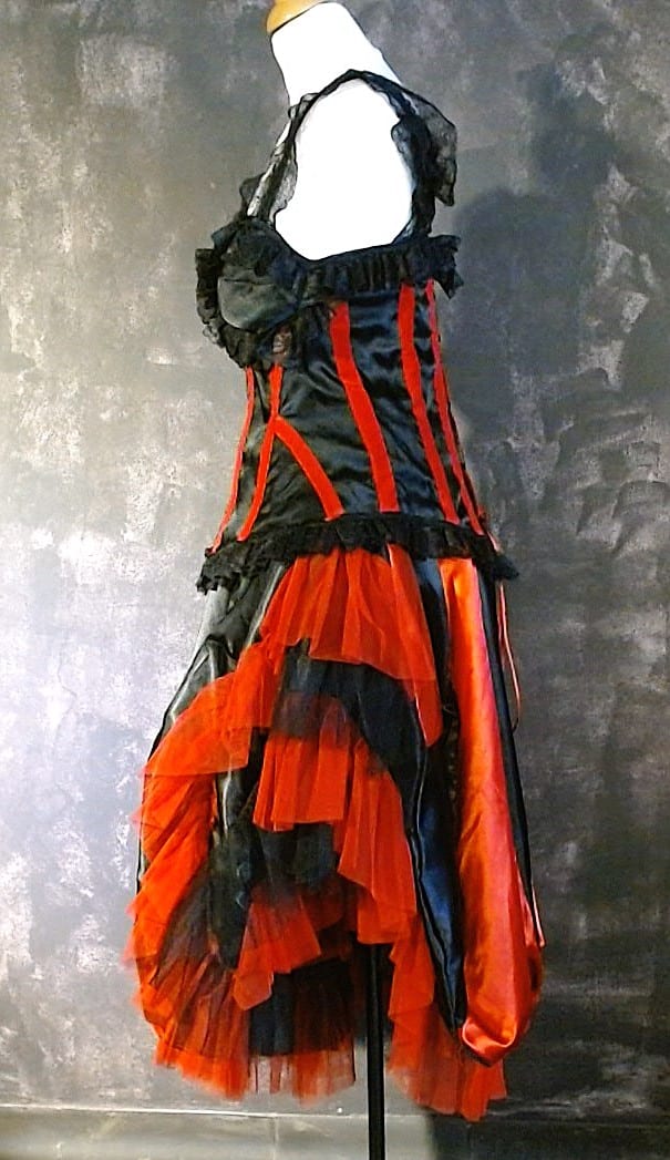 Ensemble composé d'un bustier et d'une jupe. Satin rouge et noir. Intérieur de la jupe garni de volants