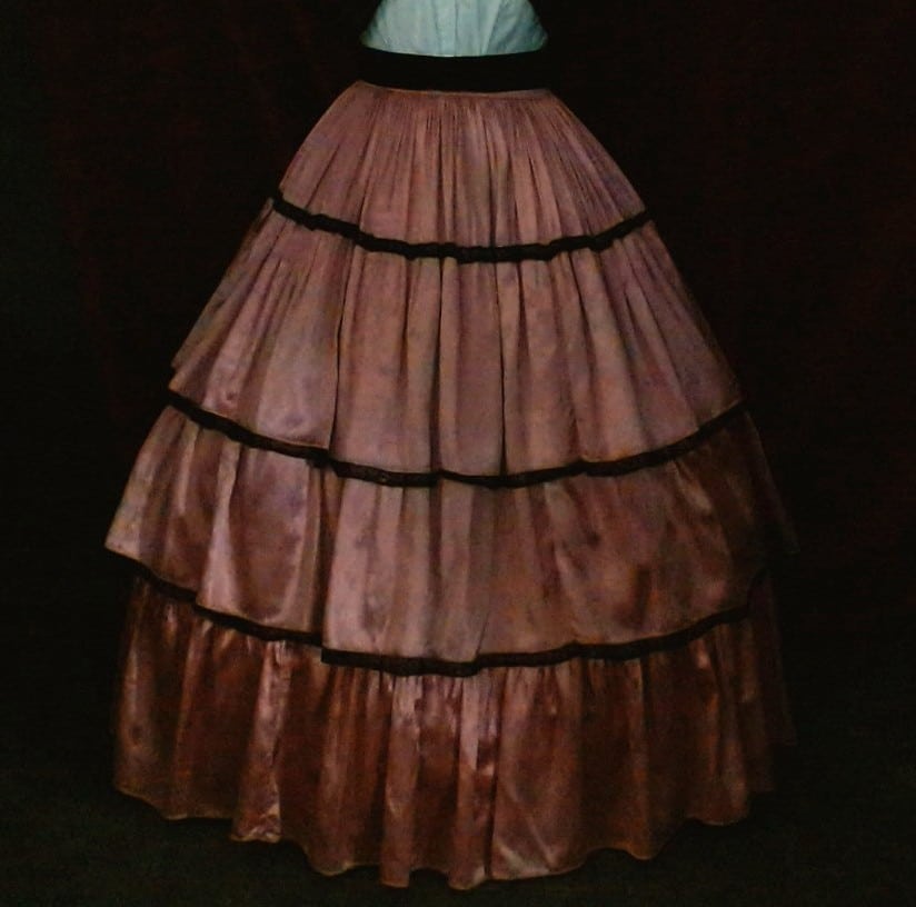 Grande jupe en satin rose garnie de trois volants bordés d'une fine dentelle noire