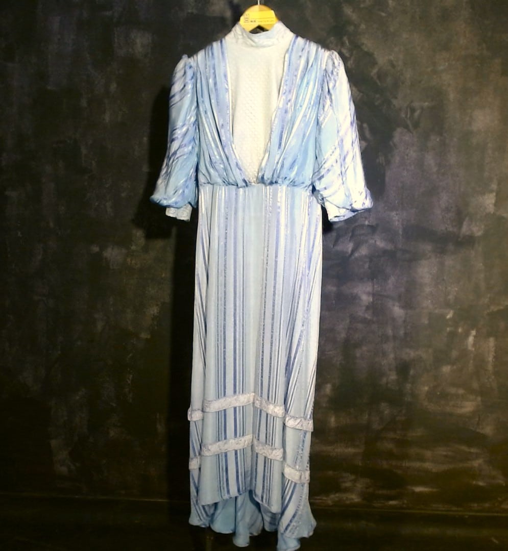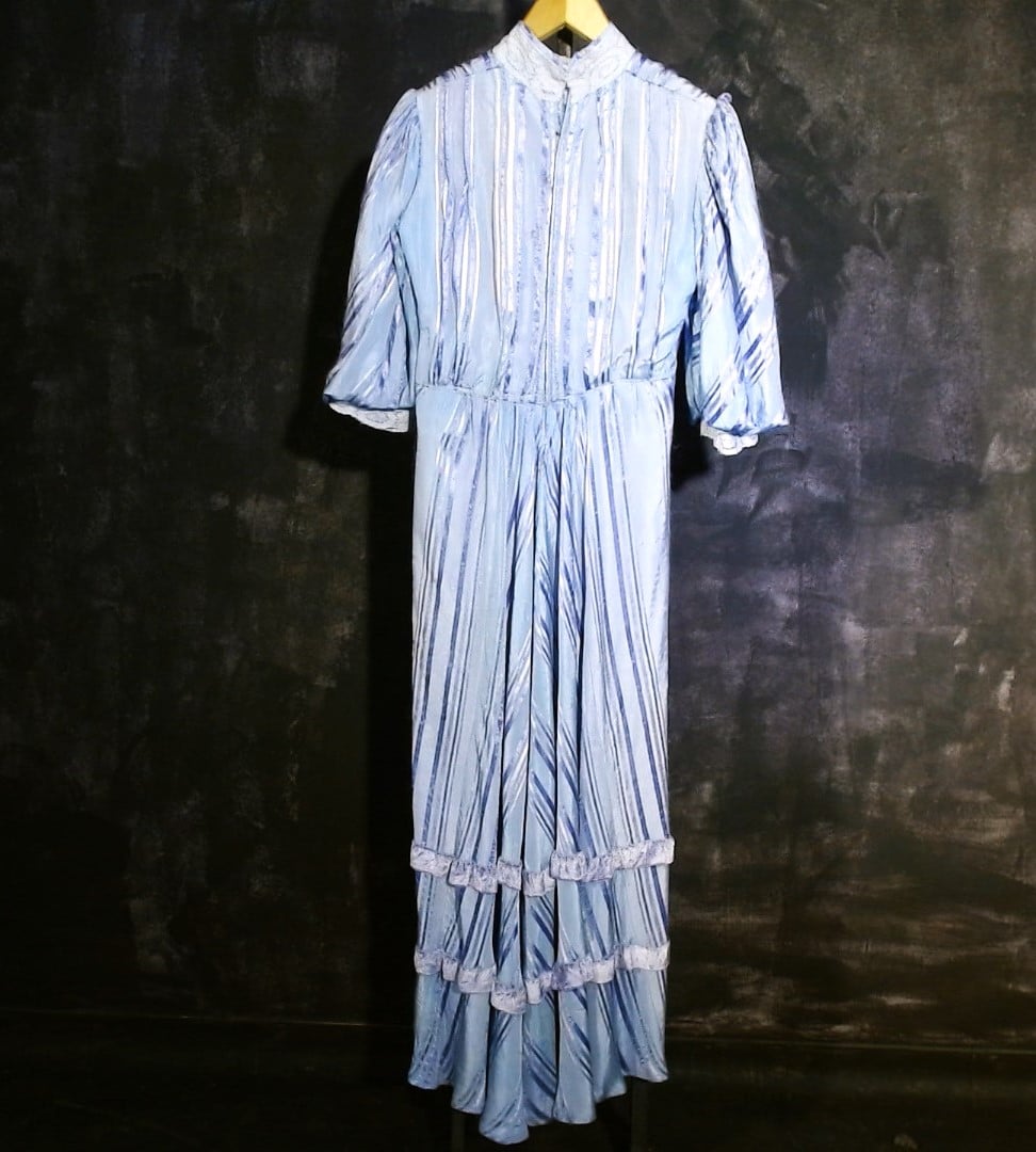 Robe Belle Epoque bleu ciel à rayures mauves col cheminée garni de dentelle