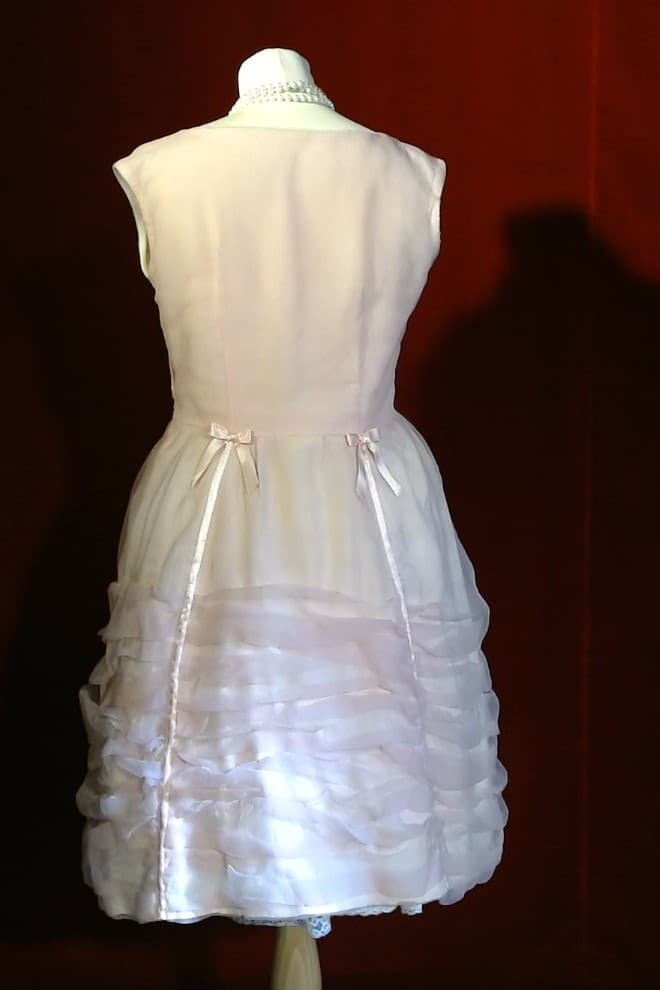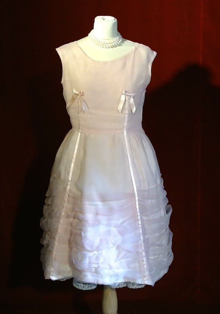Charmante robe cocktail, années 50, drapée d'organza de soie rose, avec un décor de ruban rose